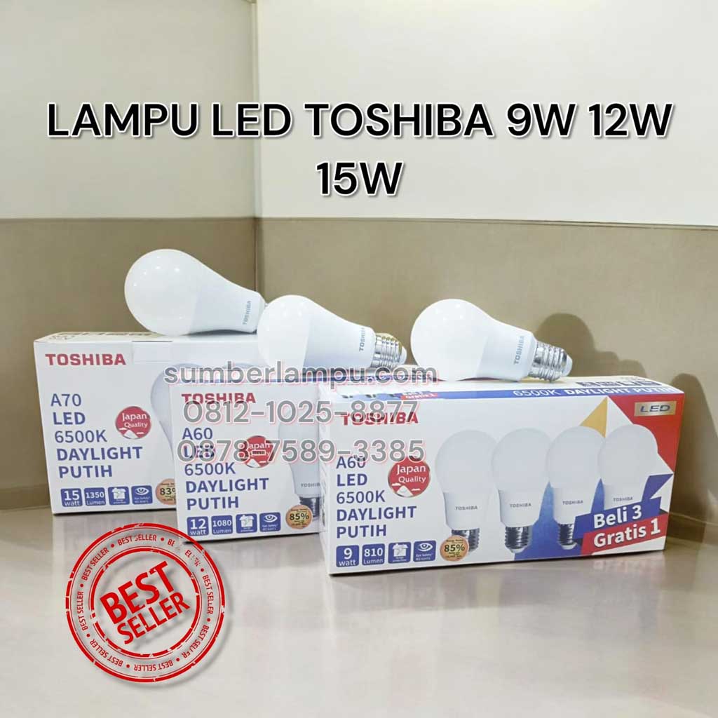 Lampu TOSHIBA LED 9W 12W 15W Terbaru, dijual per pack 3 bonus 1, hemat listrik 80%, harga terjangkau & lampu tetap berkualitas terbaik.