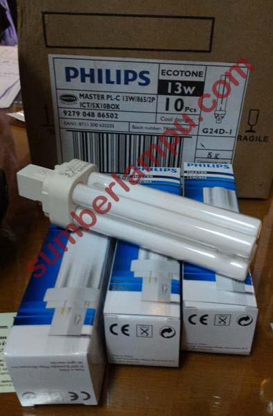 Lampu Philips master PL-C 13watt ecotone cool daylight, adalah lampu lampu Philips CFLni jenis PL-C, kompak dan hemat energi yang mempunyai tabung cahaya dengan gas merkuri bertekanan rendah terdiri dari 2 tabung ramping sejajar untuk jenis PL-S & PL-L serta 4 tabung ramping sejajar untuk PL-C.