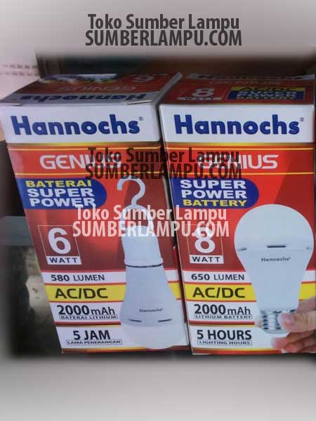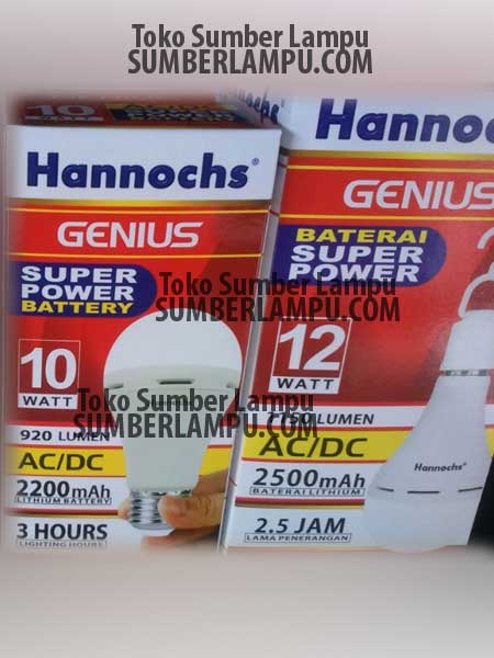 Lampu Hannoch emergency genius 12 watt LED bulb adalah bola lampu darurat LED dengan variasi watt 12 watt, 10 watt, 8 watt 6 watt yang mempunyai durasi ketahanan emergency bervariasi pula sesuai kebutuhan yang diinginkan, lampu ini mempunyai fitur penting dan terbaru yang dapat bekerja di voltase AC dan DC sehingga dapat dipakai berbagai situasi yang dapat sebagai penerangan lampu darurat atau untuk penerangan di luar ruangan yang jauh dari sumber listrik PLN.