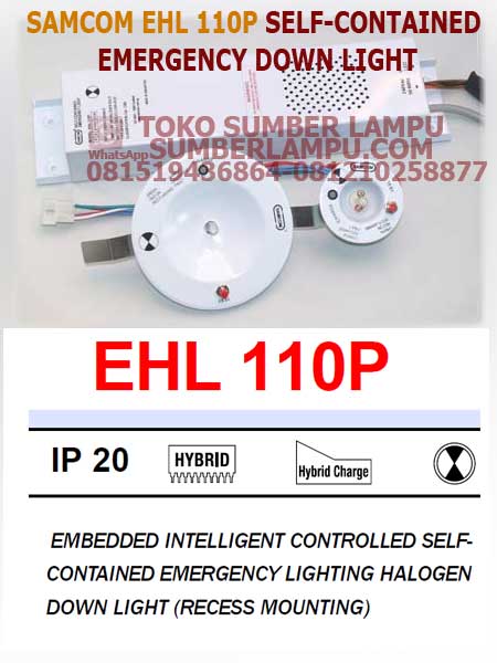 Lampu Emergency merk Samcom EHL-110P, dirancang dengan unit kontrol cerdas tertanam terkomputerisasi, dengan diagnostik diri dan pengisi daya cerdas, untuk kapasitas baterai pemulihan cepat dengan satu LED bi-warna untuk menunjukkan kondisi fungsi sistem.