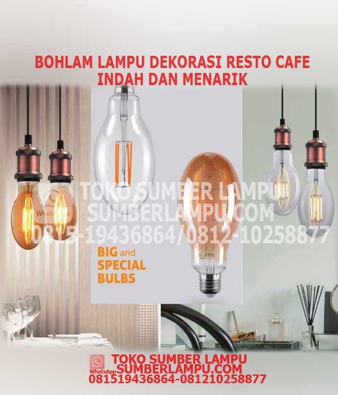 Bohlam lampu dekoratif untuk resto cafe dengan ukuran besar bentuk yang menarik, tidak hanya sebagai penerangan saja tetapi juga memberi nuangsa artistik, indah dan nyaman bagi orang disekitar.