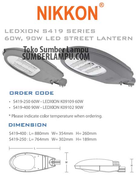 Lampu jalan pju LED 90 watt adalah varian produk Ledxion S419 series merk Nikkon yang ada di pasaran yang sudah teruji dan handal dari segi kualitas dan umur pemakaian serta distribusi output cahaya merata dan stabil. Ada satu produk di bawah 90 watt ini yaitu 60 watt untuk series S419 dengan kode produk S419-250 60w LEDXION K09109.