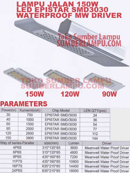 Produk ini datang dengan beragam variasi watt yang dapat dipilih sesuai kebutuhan di lapangan dari 30 watt sampai 150 watt, dilengkapi chip LED berkualitas dan komponen driver dari Meanwell waterproof (gear & compartment).