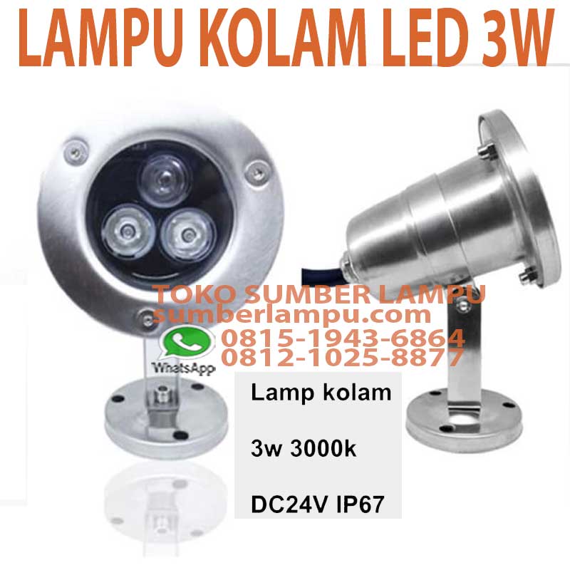 Lampu Kolam LED 3W DC 24V 3000K IP67, material steinless steel, sudah termasuk LED berkualitas, aman dipakai dalam air.