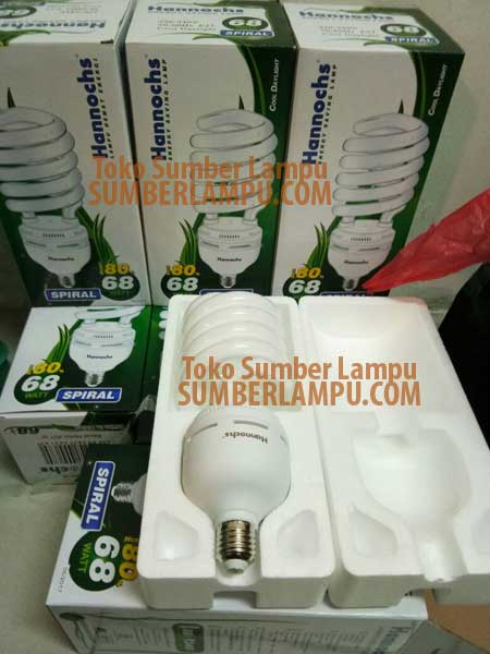 Lampu Hannoch spiral 68 watt adalah jenis ulir hemat energi sampai 80% setara 340 watt dibanding jenis konvensional, lampu yang banyak fitur dari instant on atau langsung nyala sampai bekerja di voltage AC170~250v sehingga aman. Lampu berbentuk spiral atau ulir ini mempunyai daya pakai 8000 jam lebih lama dibanding produk lain yang sejenis.