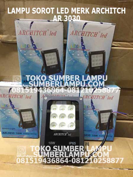 Lampu sorot LED merk Architech 10 watt menggunakan LED chip berkualitas tipe SMD 3030 yang output kontrast lebih baik dibanding produk pada umumnya, lampu ini handal untuk pemakaian outdoor maupun indoor dan jenis lampu hemat listrik.