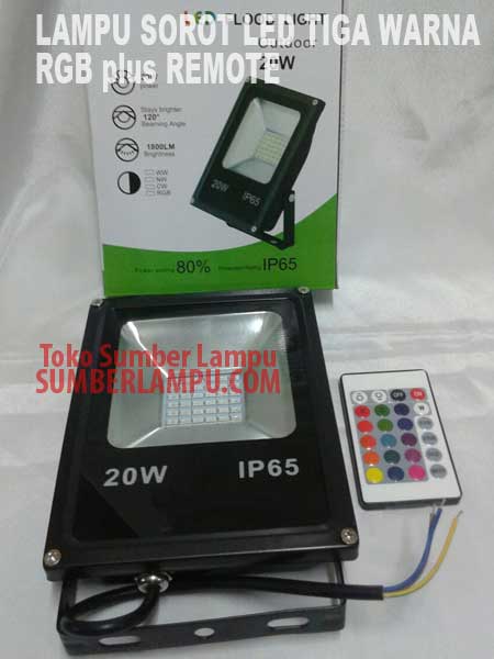 Lampu sorot tiga warna RGB 20 watt adalah lampu sorot yang memancarkan sinar warna warni yang menarik ( eye-catching ) dan bersifat dekoratif, handal untuk pemakaian indoor maupun outdoor karena proteksi IP65 yang tahan terhadap air dan debu.