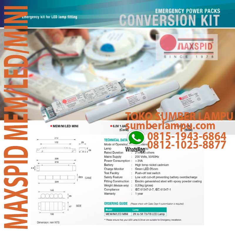 MAXSPID MEM LED MINI for T5/T8 LED, mode maintained, baterai tipe high temp nickel cadminium, compliance: IEC61347-2-7, IEC61347-1.